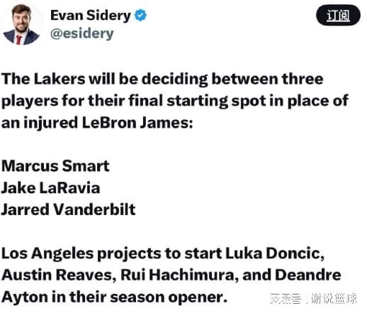 如今即便詹姆斯受伤,湖人先发阵容还是确定四席,包括东契奇、里夫斯、八村塁再加上艾顿。至于第五个名额,就是三选一的状态,斯玛特、范德比尔特以及拉拉维亚,都有可能进入先发阵容。